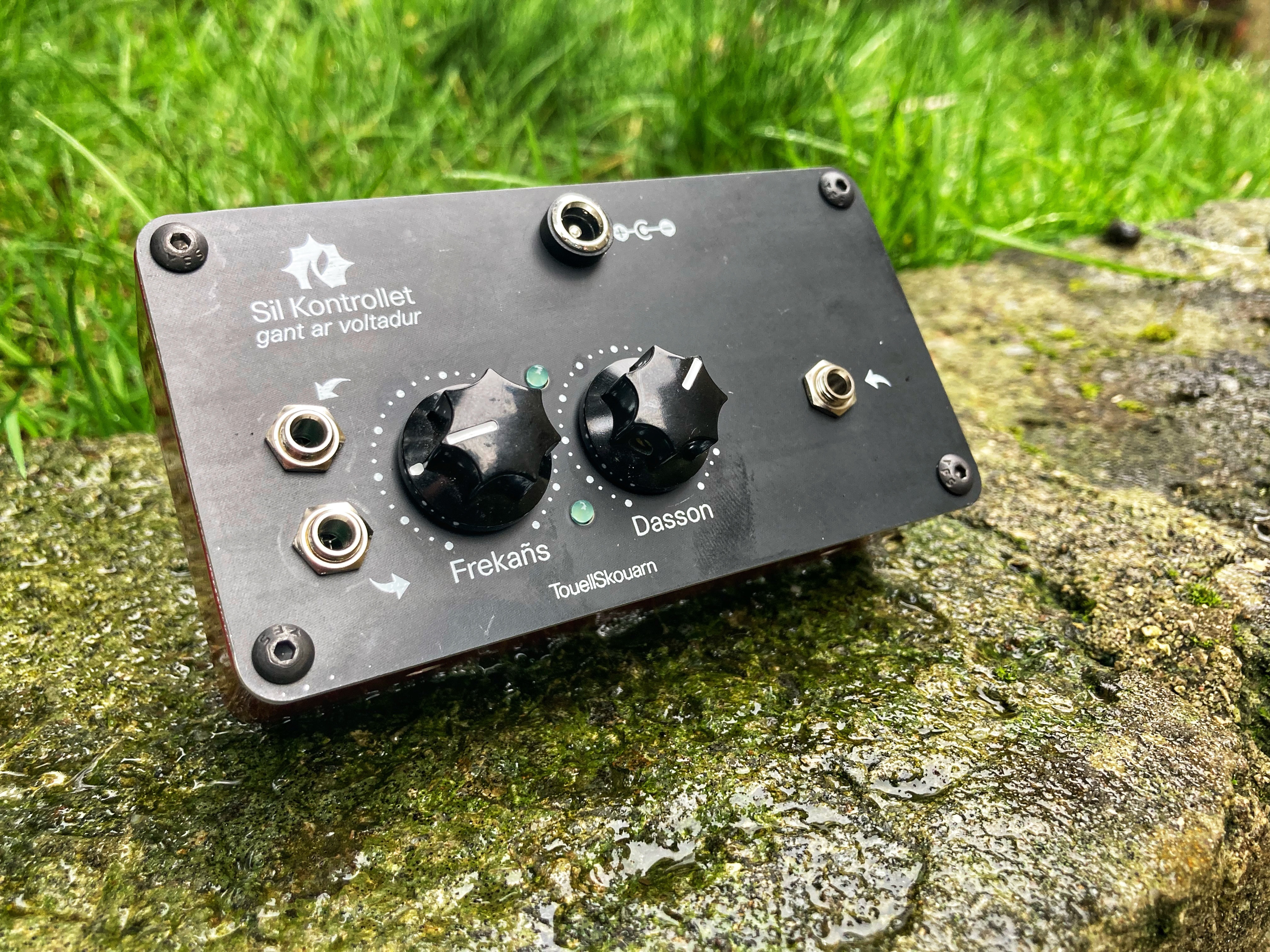 The Touellskouarn “Sil Kontrollet” tabletop module is a LowPass voltage-controlled filter (VCF) The filter is a 12dB per octave low-pass filter that can be self-oscillated, this way it can produce a sine wave with V/Oct tracking capability. This filter has a unique and distinctive sound, characterized by its aggressive resonance and its ability to self-oscillate. Cutoff can be cv controlled. The enclosure is all aluminium and the circuit is made with quality components such as Nichicon/Panasonic caps and alpha pots. The module is powered thru a 2,1mm negative pin power jack, compatible with Boss and Ibanez standard power supplies.